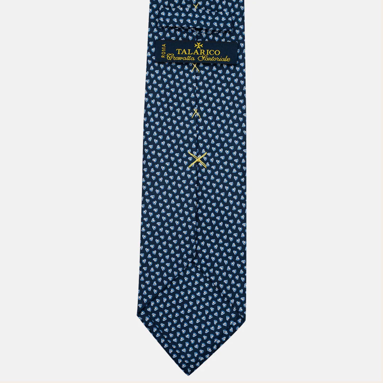 「3つ折り」ネクタイは、シルクで作られたクラシックなネクタイです。1メートルの生地から手作業で裁断・縫製し、隅から角まで3回折ります。イタリア コモ産のシルク生地を贅沢に使用しています。オールハンドメイドのため、大量生産をせず、1本1本に時間をかけて丁寧に作っています。1つの柄は4本しか作らないタラリコのこだわりがあり、世界での流通量には限りがあります。シルクの滑らかさとしっかりとした生地はノットを美しくみせ、最高の締め心地。そして、とてもエグゼクティブな印象をあたえます。