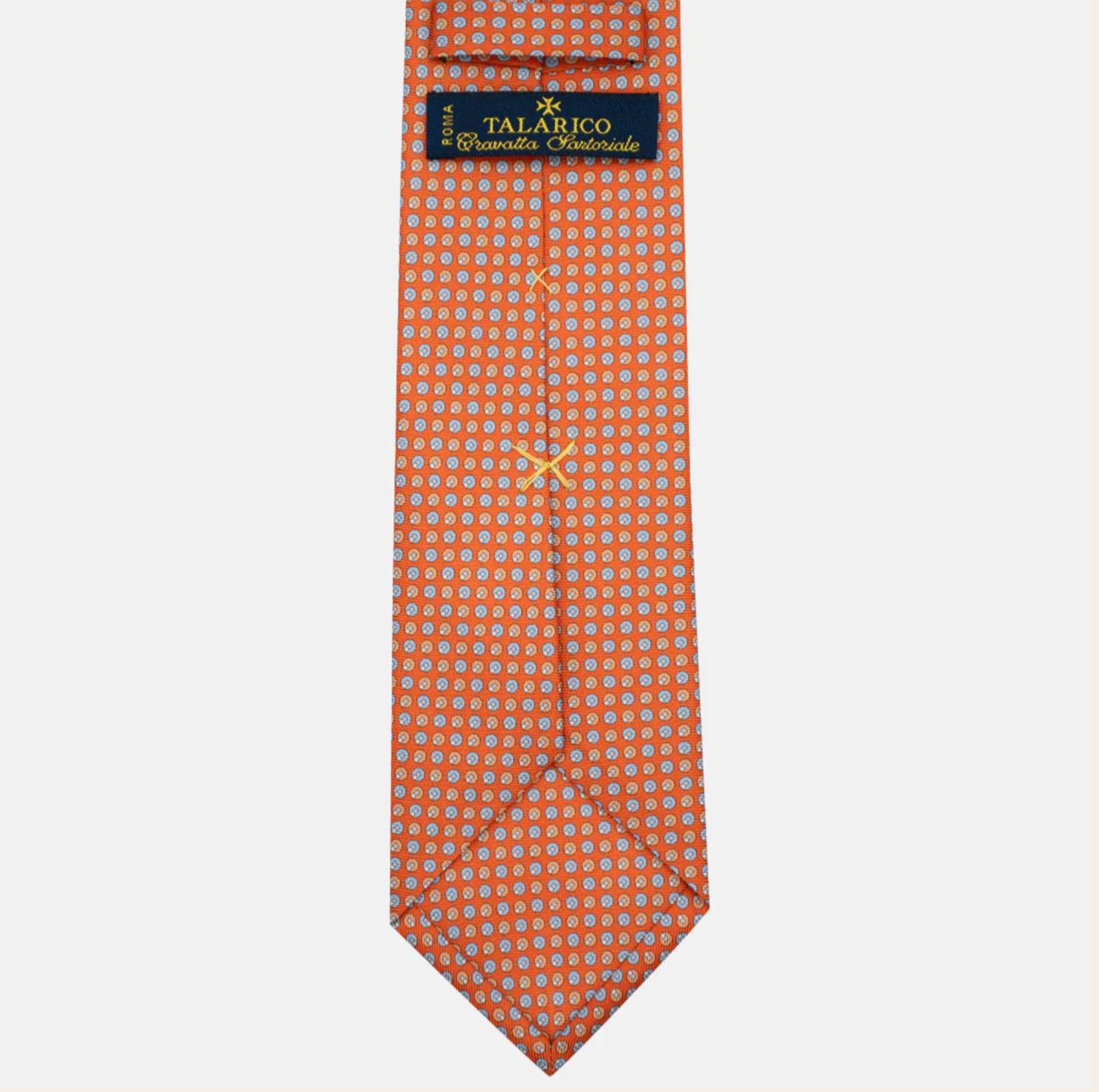 「3つ折り」ネクタイは、シルクで作られたクラシックなネクタイです。1メートルの生地から手作業で裁断・縫製し、隅から角まで3回折ります。ブレードとテールの裏地は同じ生地で作られており、イタリア コモ産のシルク生地を贅沢に使用しています。オールハンドメイドのため、大量生産をせず、1本1本に時間をかけて丁寧に作っています。1つの柄は4本しか作らないタラリコのこだわりがあり、世界での流通量には限りがあります。シルクの滑らかさとしっかりとした生地はノットを美しくみせ、最高の締め心地。そして、とてもエグゼクティブな印象をあたえます。